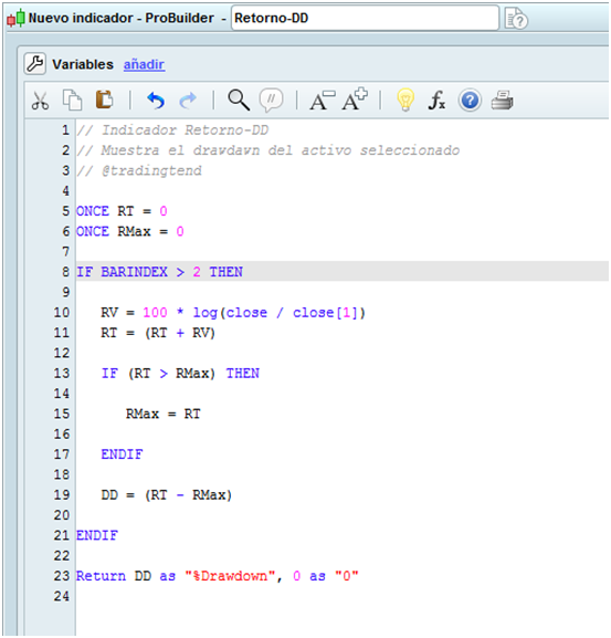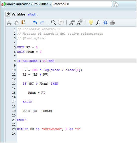 Hola Nicolás , el indicador me gustaría que muestre el máximo drawdown , tipo como RSI , que puedas ver el drawdown de cualquier valor , índice etc.. no sé cómo se puede hacer , gracias