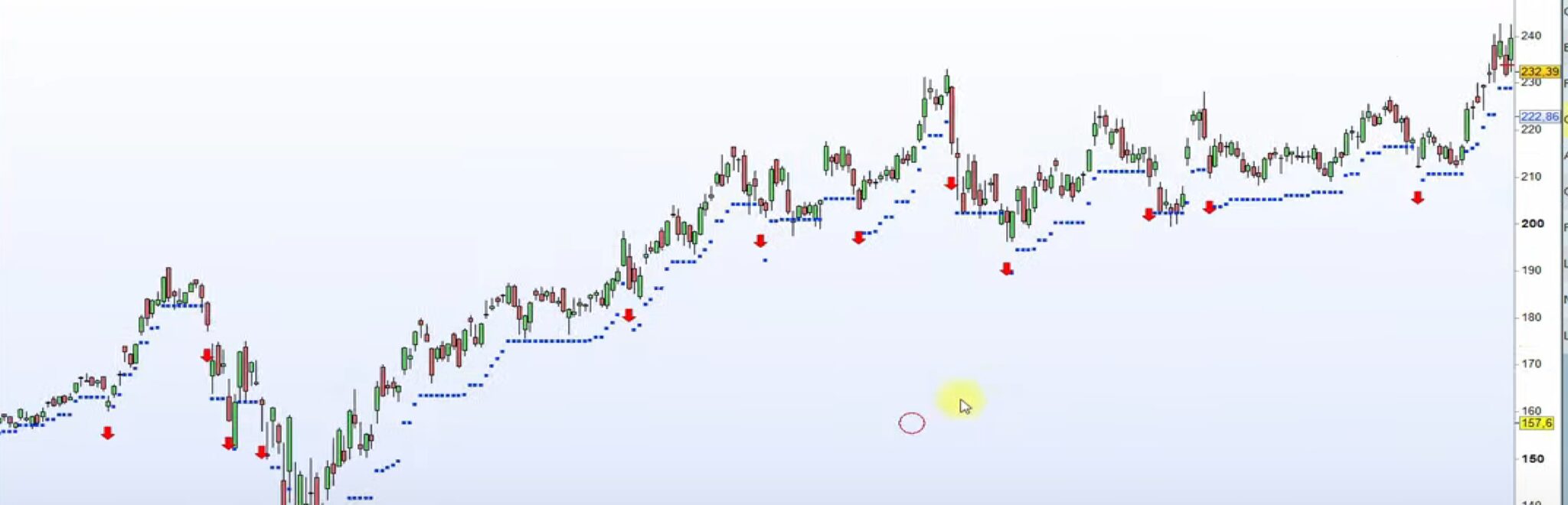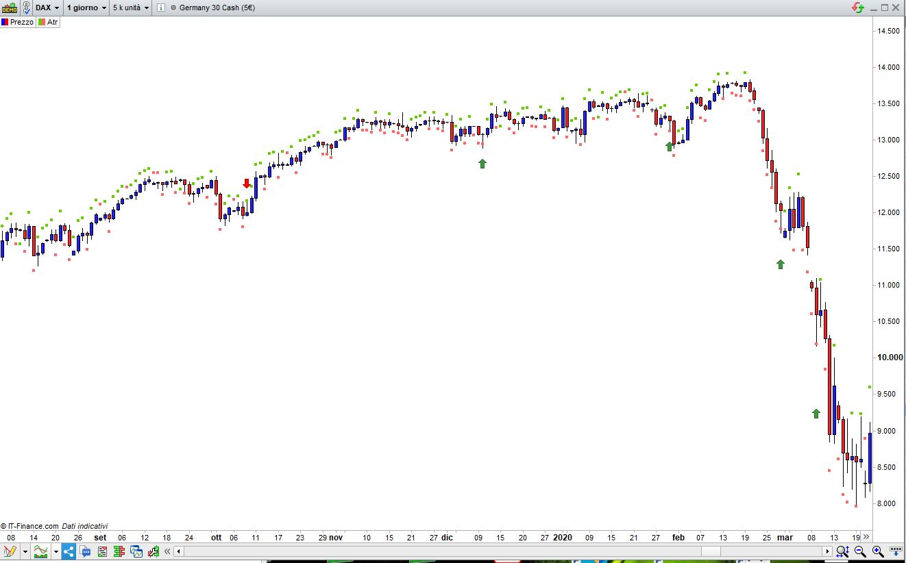 Intento realizar un indicador, pero no entiendo de codificación. Se trata de un indicador que está basado en el ATR, en la imagen está puesto como stop loss para largos, yo lo quisiera para cortos, de tal manera que van saliendo los puntitos del ATR arriba del precio y cuando el máximo de una vela tocara el ATR se marcaría la flechita, necesitaría que el ATR fuera configurable tanto en periodos como en cantidad de ATR (x 0.5 , x 1, x 1,2 etc)