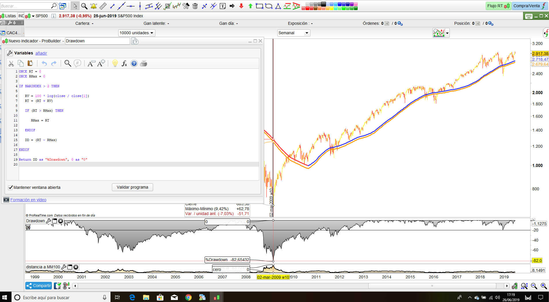Correcto. Tengo éste que te muestro en el archivo adjunto pero no va bien. Ves por ejemplo que el Drawdown del SP500 en el 2008 marca un 82% y el SP500 corrigió realmente un 56%. Además en Diario y en Semanal marcan porcentajes diferentes. Sería ese mismo indicador pero que sea más exacto. Y luego por otro lado me gustaría un código para un proscreener para con ese indicador filtrar por ejemplo qué acciones han tenido en los últimos (por ejemplo 10 años) un Drawdown inferior a un 25% para hacer una lista con acciones (USA) con poca volatilidad.