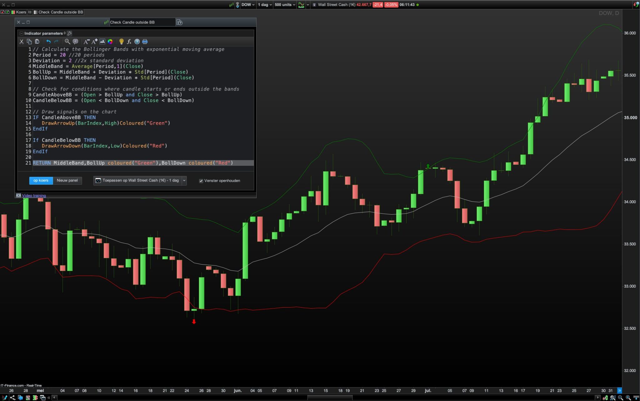je voulais me faire un petit indicateur qui m’indique quand une bougie commence et fini en dehors des Bollinger paramétrées en exponentielle sur une période de 20. Existe t’il une fonction que je peux utiliser?