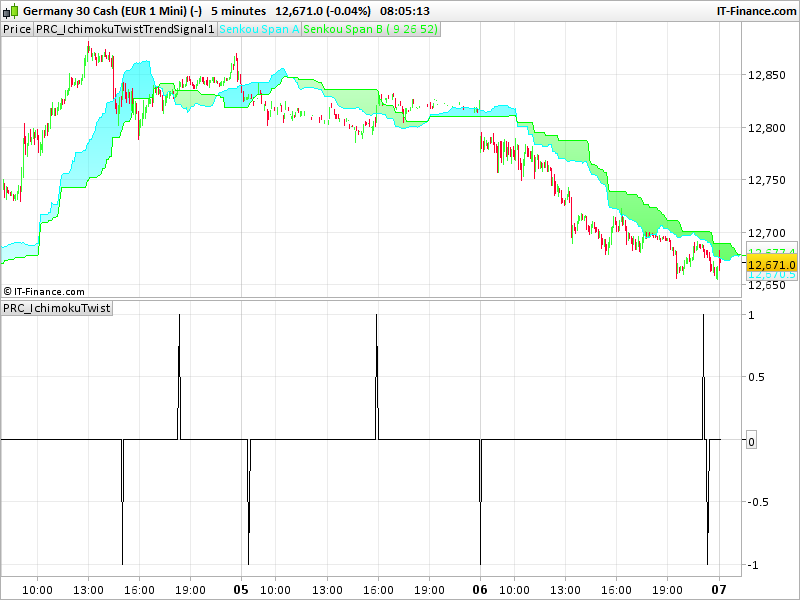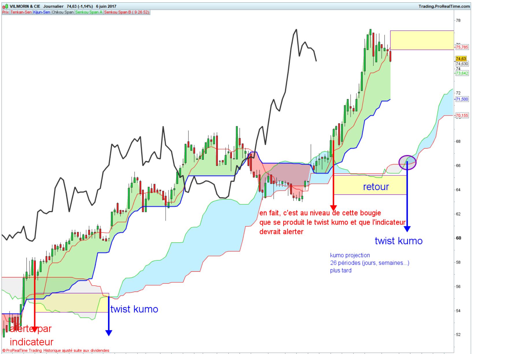 Je “ranime” cette file car je cherche à coder un indicateur ”en temps réel” du twist kumo d’Ichimoku. Ce nuage est en fait la projection en avant dans le temps / 26 bougies de l’UT choisie et son twist serait anticipateur du mouvement à venir. Il existe bien un indicateur créé par Doc trading mais cet indicateur alerte avec 26 jours ou semaines de retard et ne correspond à l’utilisation que les amateurs d’Ichimoku font du twist kumo. Pouvez-vous nous aider?