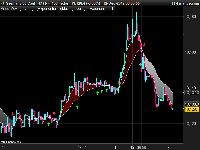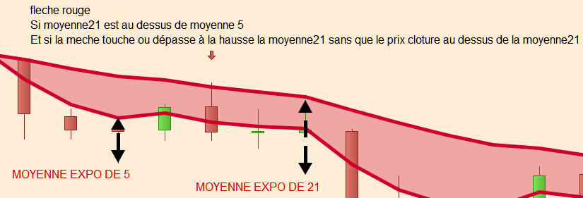 une flèche rouge sur les bougies (peux importe la couleur des bougies) qui on une mèche haute qui touche ou dépasse la moyenne mobile longue [21] si tendance baissière ( moyenne mobile longue [21] est au dessus de la moyenne mobile expo courte [5] )