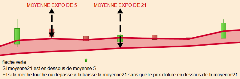 une flèche verte sous les bougies (peut importe la couleur des bougies) qui on une mèche basse qui touche ou dépasse la moyenne mobile longue [21] si tendance haussière ( moyenne mobile longue [21] est en dessous de la moyenne mobile expo courte [5] )