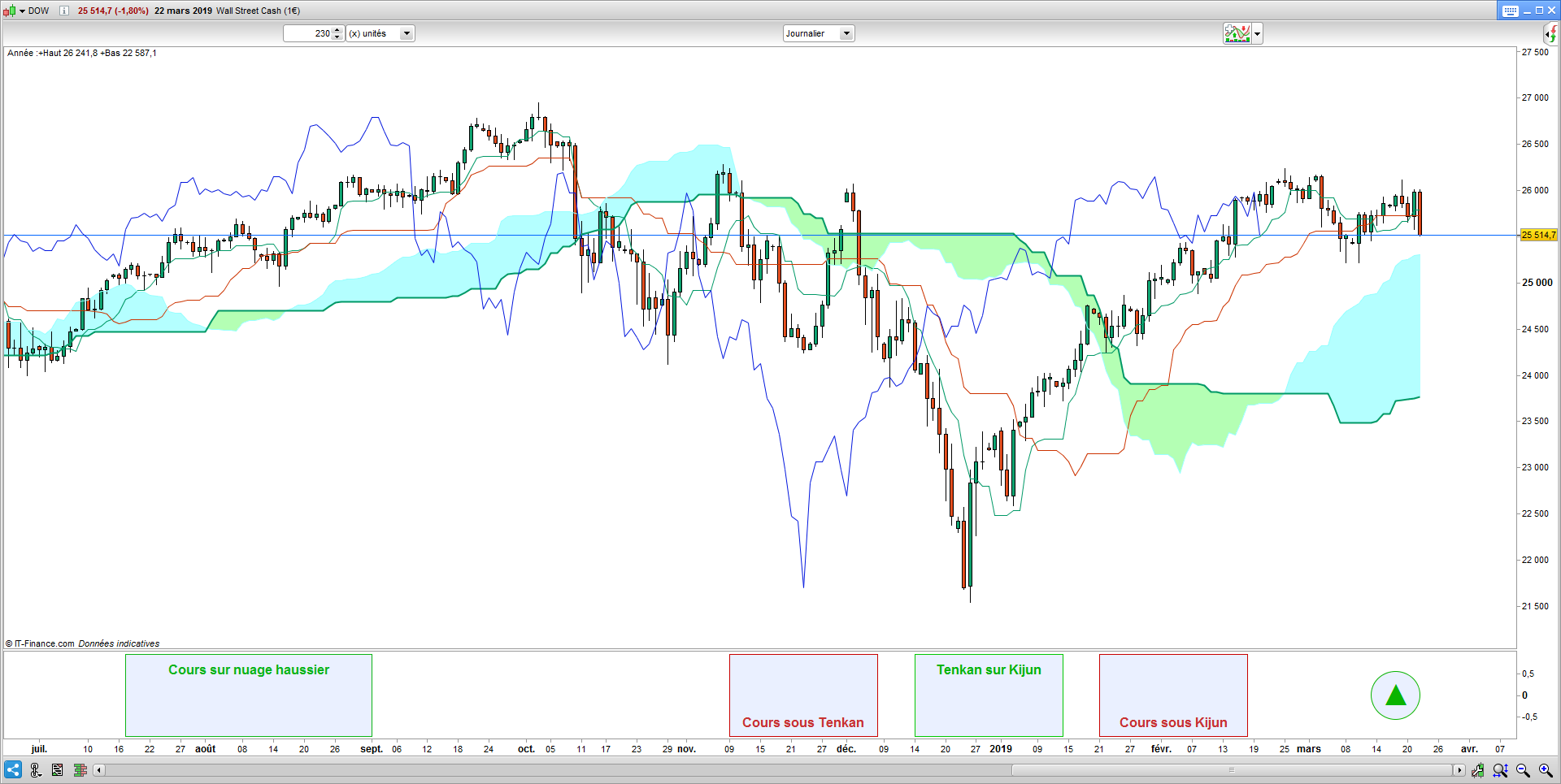 la tenkan, kijun et kumo ont les paramétres par défaut de 9,26 et 52 periodes.