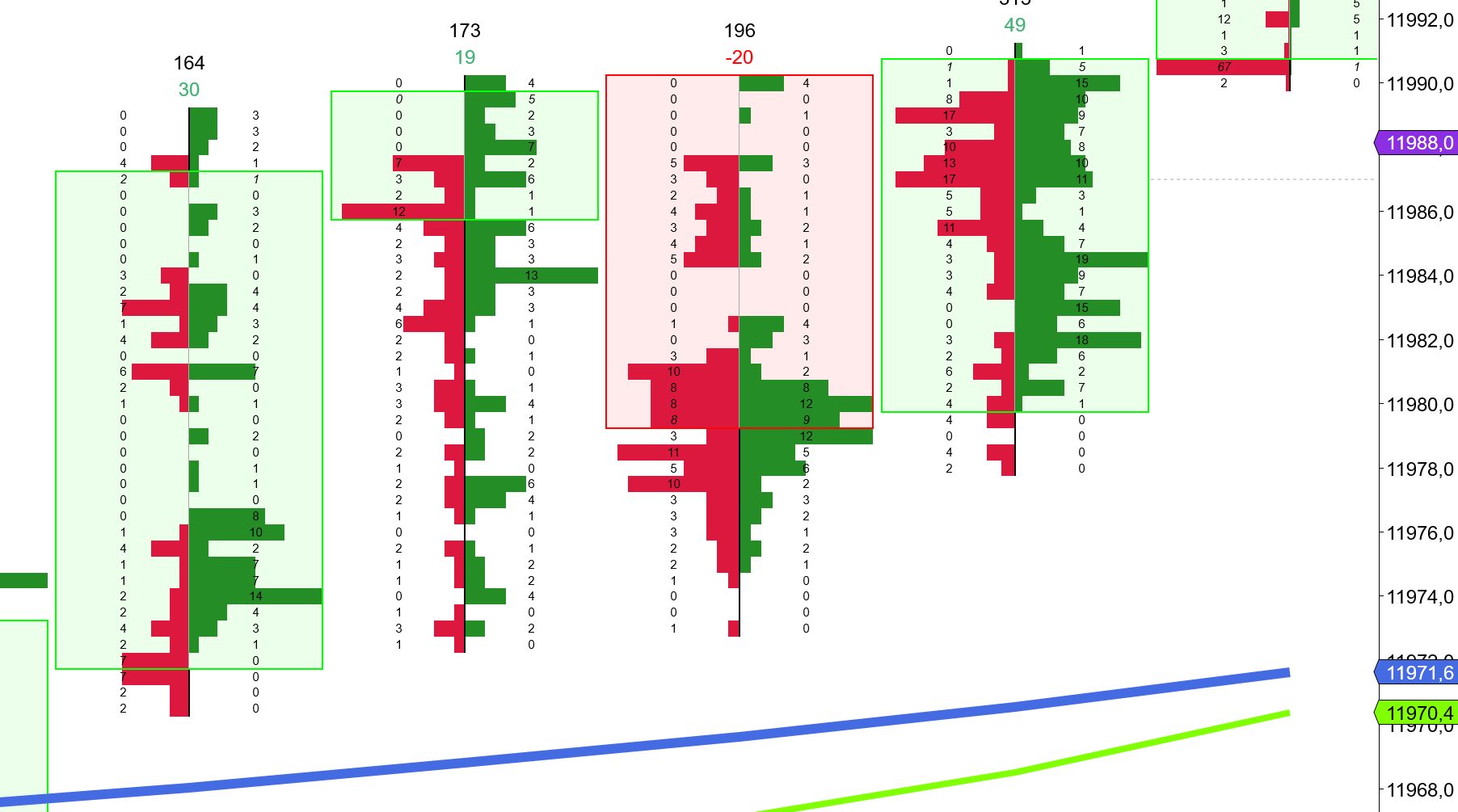 J’aurais voulu savoir s’il est possible de concevoir un indicateur comme indiqué sur le document attaché qui permet de lire le total volume en haut de la bar, le delta volume (sous le total volume), de créer un histogramme de volume usr chaque bar avec l’affichage du volume traité sur chaque niveau de prix à l’achat comme à la vente?