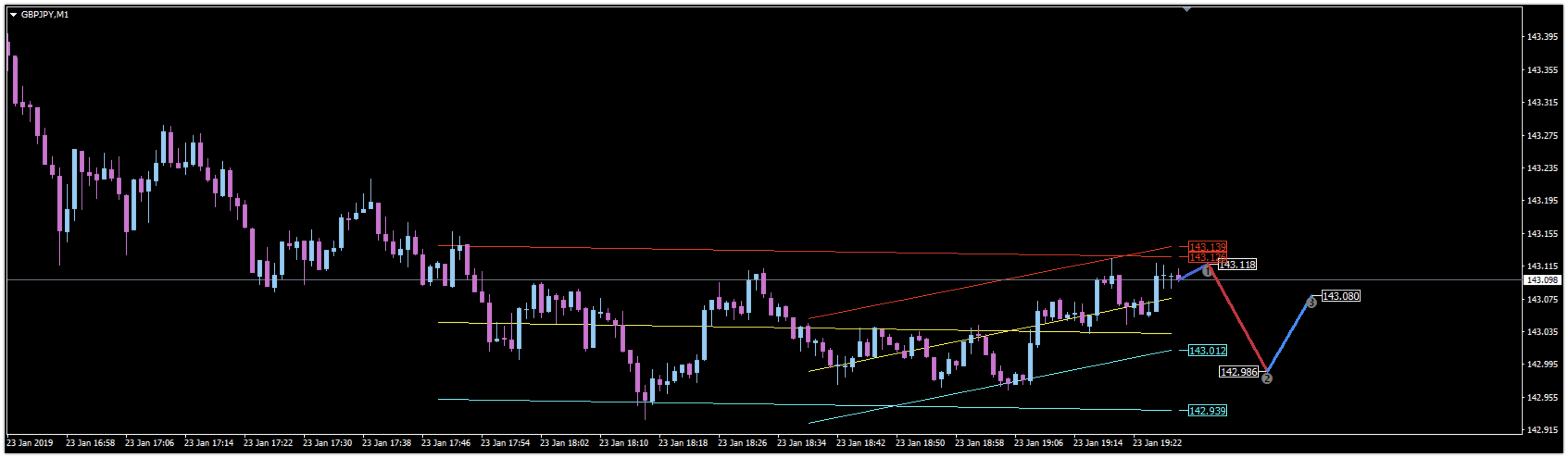 Sans le code source, cela va être difficile… Pour les canaux, ce sont de simples canaux de regression linéaire, ça c’est ok. Pour le “forecast” avec les points 1,2,3 , je pense que c’est une projection logarithmique ou polynomiale issue de l’interprétation des 2 canaux, mais je ne peux en être certain sans le code source ou un peu plus d’explication sur l’indicateur en lui même.