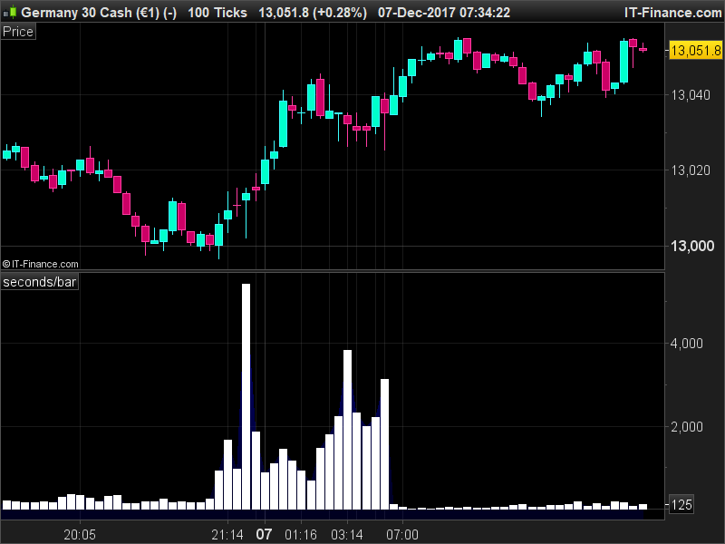 Je souhaiterai en fait créer un indicateur qui ressemble aux volumes, ou même une courbe peu importe, qui lorsque la durée des bougie en 17 ticks diminue, l’indicateur monte comme des volumes ou une courbe ascendante, et lorsque la durée des bougie s’allonge il baisse.