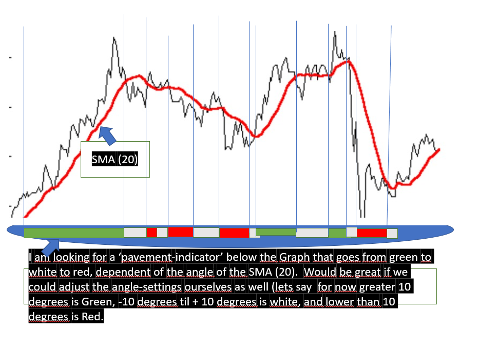 Would be nice below the grafh visual to see, see my draw 😉 . But if its easier it can be placed right into the SMA itsself that changes of colour from Red tot White to Green and back.. depending of the percentage one chooses, is also nice!. And if its possible in the code to change the SMA(20) in a lets say SMA (14) would also be great! We all can try different settings and calculate the system in a normal backtest, with no optimalisation that makes it more ‘wishfull thinking’ to the future ahead. And even to use intraday.