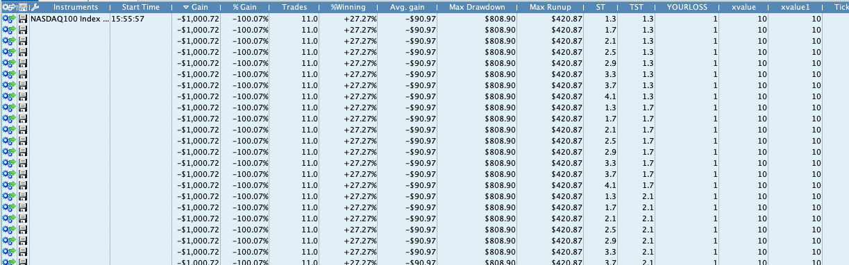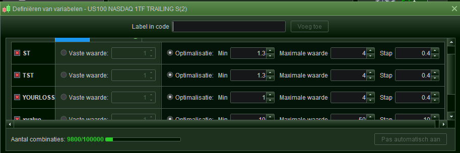 The only way to test different sets of values for ST, TST etc., was to remove all the variables from the optimiser window, and change the values in the program code itself. But I prefer using the PRT optimiser for these tests. Any idea?