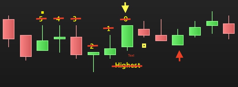 - When the highest bar of the previous range of bars (max. 6 bars) has been highlighted then the indicator need to ‘scan’ the next candles for the highest or lowest candle within a range of 2 points