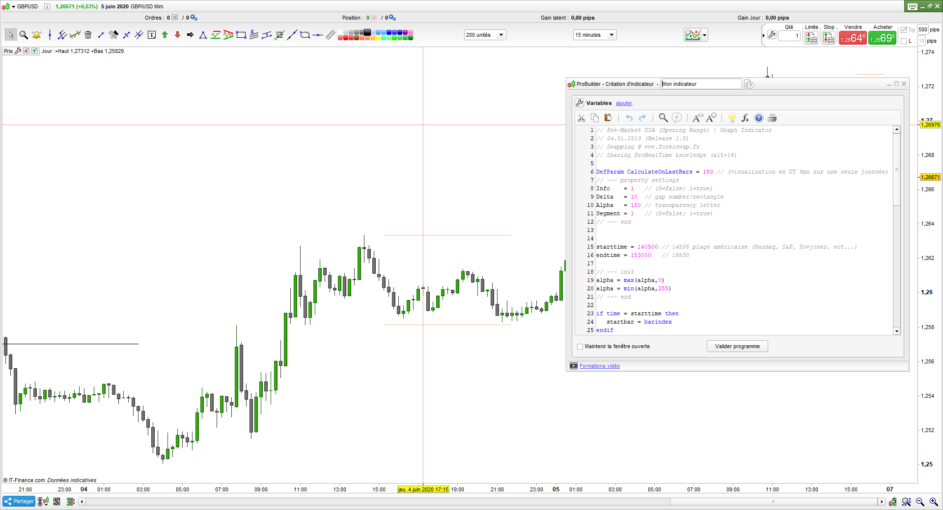 bonjour nicolas effectivement je suis chez IG. L’indicateur m’affiche uniquement ces deux ligne je n’ai pas les information du nombre de pips je n’arrive pas a avoir la transparence du rectangle . ET ca ne marche pas quand je change les horaire start et end?