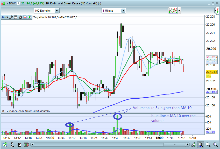 -Every time the Volume of the current candle is 3 x higher than the average Volume of the last 10 candles.