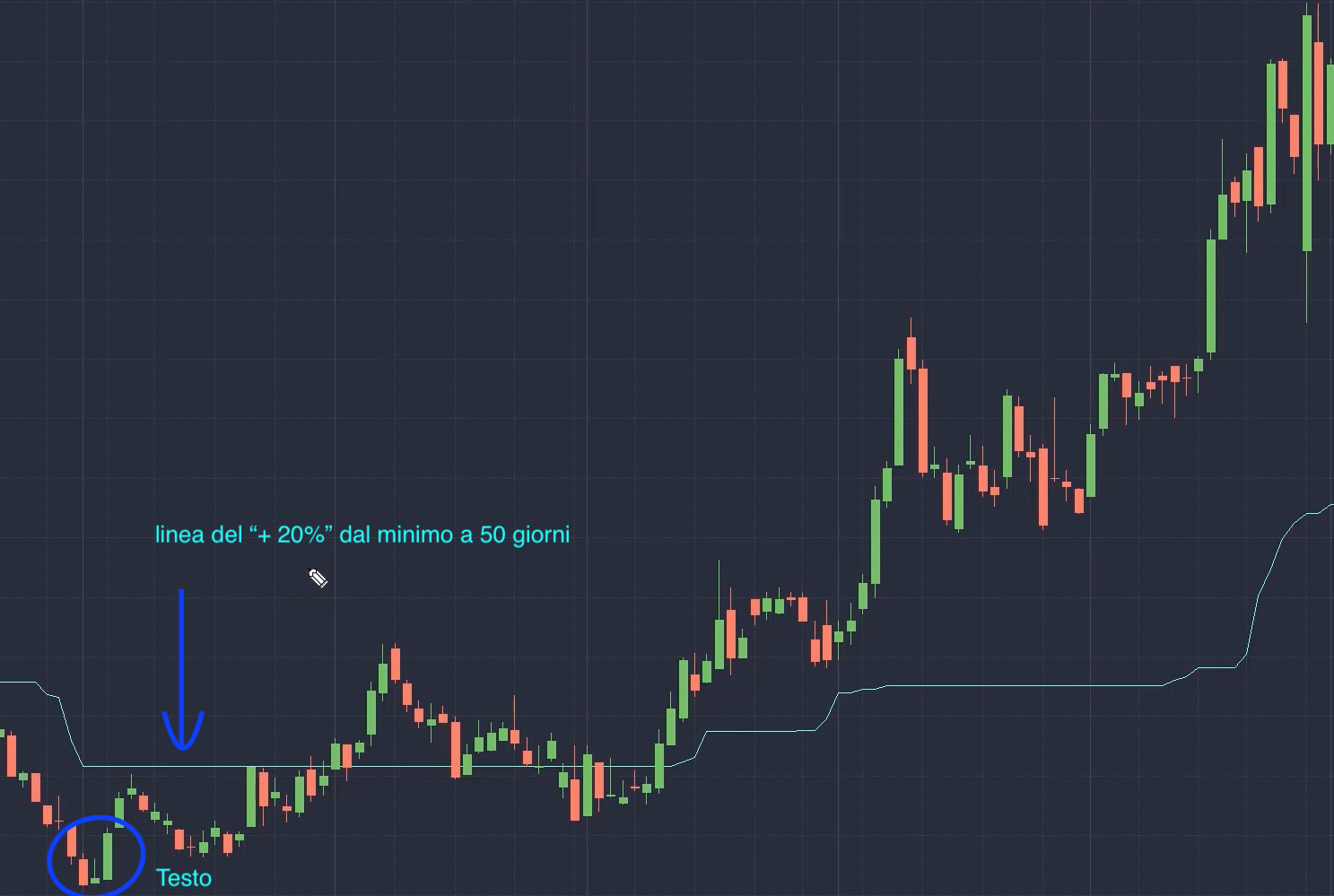 sarebbe possibile creare un indicatore che disegna sul grafico il valore del +20% dal minimo a 50 giorni??