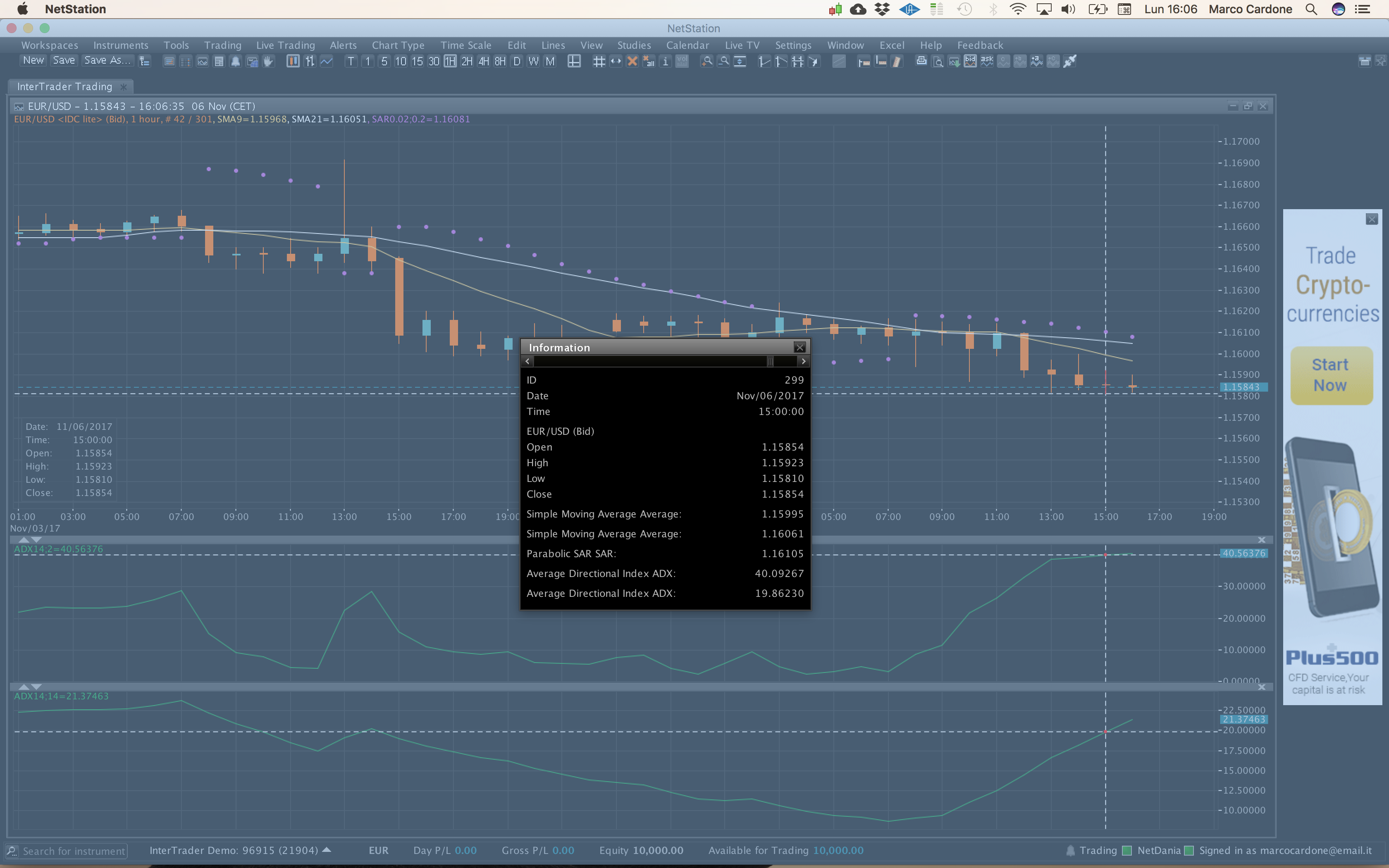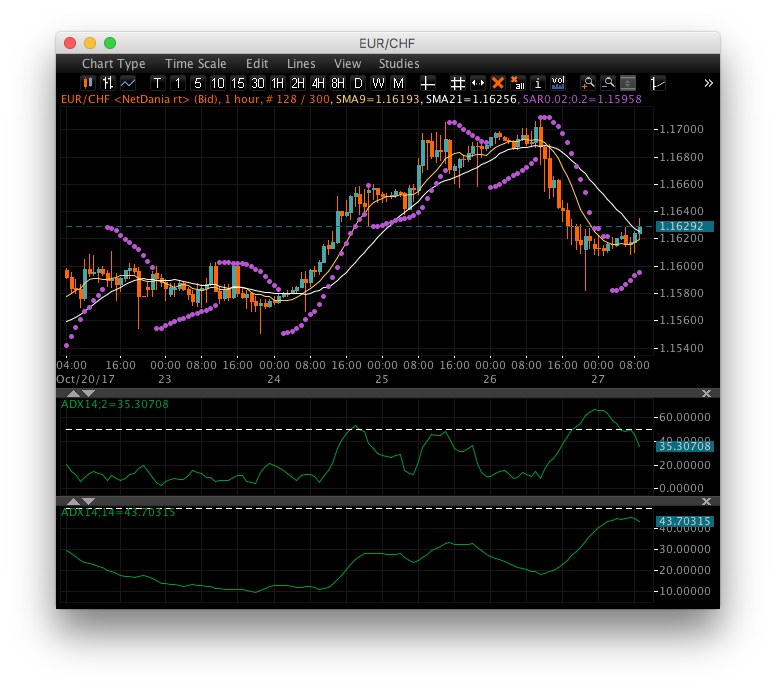 Nelle immagini si vede come in ProReal ottengo un valore per Media Mobile su ADX a 14 periodi di 16,25 , mentre in NetStation per ADX 14;2 ottengo 40,09. Stesso cambio (EUR/USD), stesso time frame (1H) e stessa candela di riferimento per i due grafici.