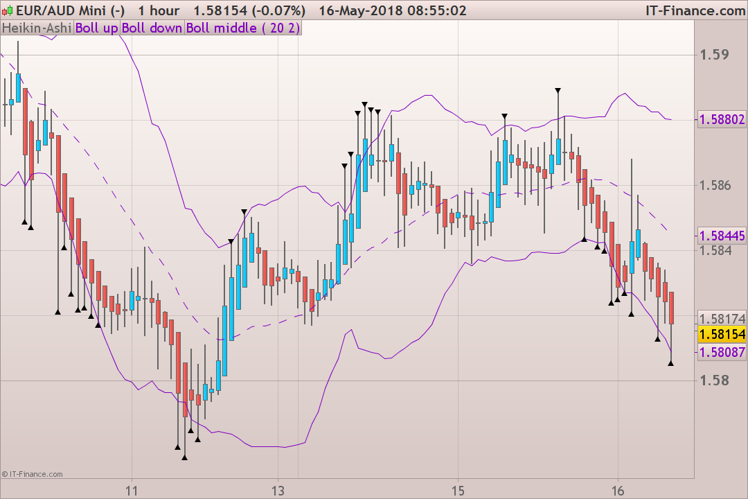 è possibile indicare con un cerchio o rettangolo quando una o più candele Heikin Ashi la loro ombra per un valore di 5 punti esce dalla BB+ e BB-.