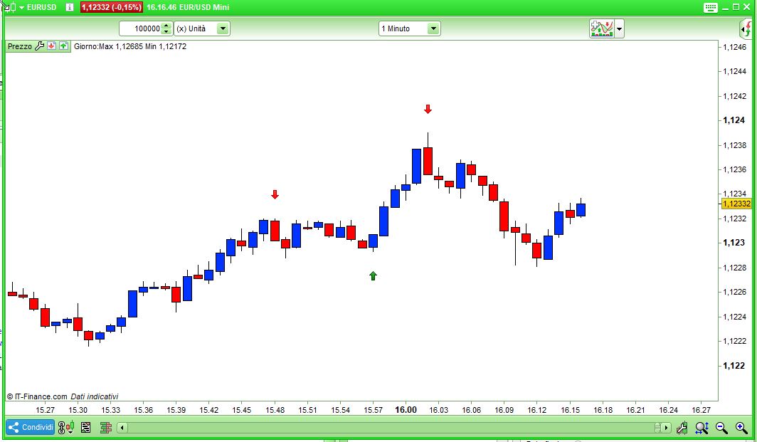 Avrei bisogno di un indicatore semplicissimo, che mi segnala con una freccia (o qualsiasi altra evidenziazione) sul grafico a 5 min una candela che abbia le 2 seguenti caratteristiche: