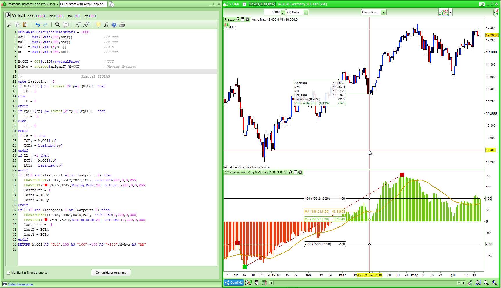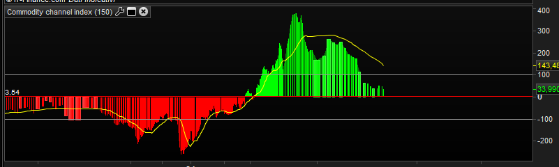volevo realizzare un indicatore Commodity Channel Index a 150 periodi con media mobile semplice a 21 periodi come in foto in allegato, aggiungendo in indicatore ZIG ZAG che disegni i segmenti tenendo conto dei valori espressi dall’indicatore