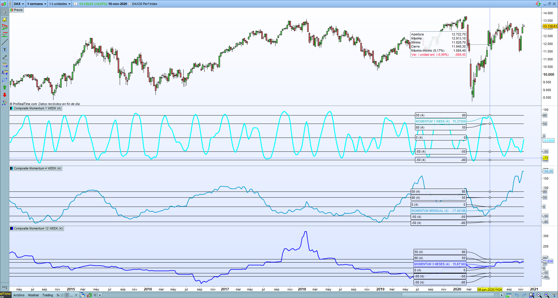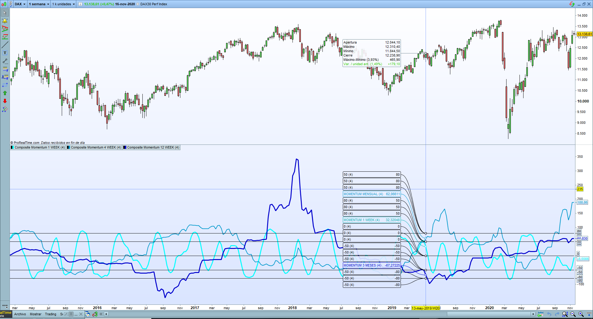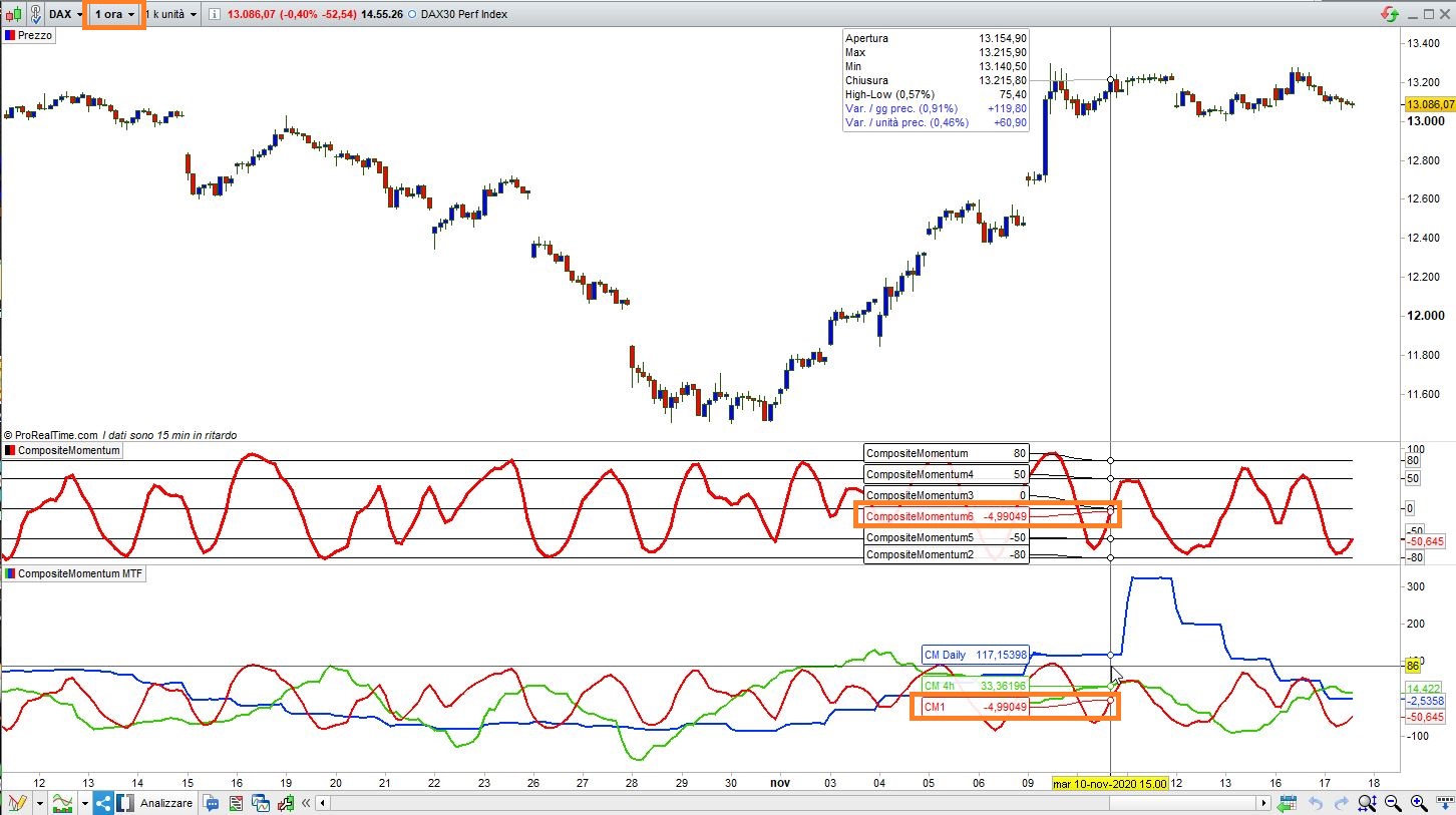 dal supporto di prorealtime mi è stato detto che da qualche mese la piattaforma è in grado di gestire il multi-timeframe. Per quanto riguarda l’analisi ciclica (nel mio caso il composite momentum del Dott. Francesco Caruso) di cui posto il link con la formula per prorealtime: