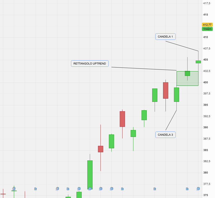 minimo ultima candela (1) è superiore al massimo della terza candela (3) allora deve disegnare il rettangolo. In questo caso il pattern è in uptrend.