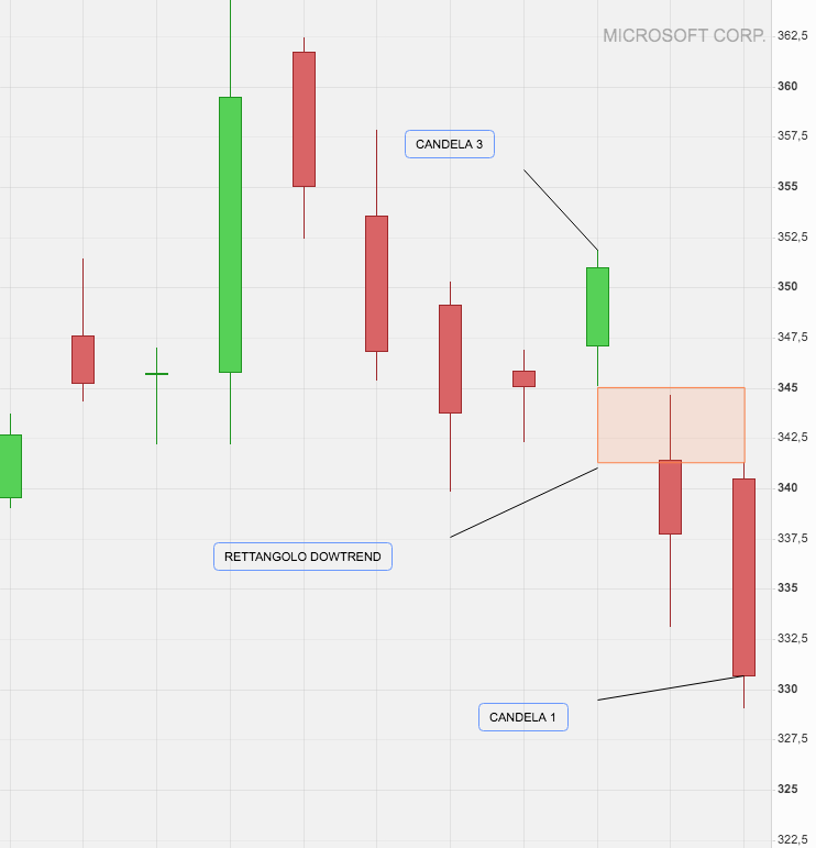massimo ultima candela (1) è inferiore al minimo della terza candela precedente (3) allora deve disegnare il rettangolo. In questo caso il pattern è in downtrend.