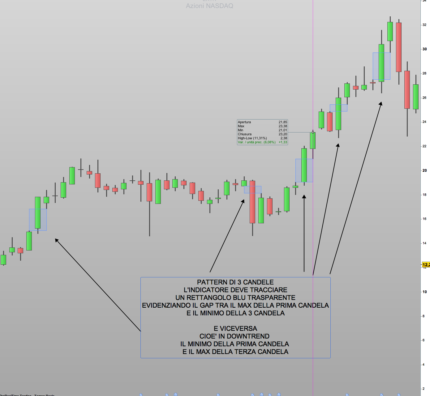 che evidenziano un pattern di 3 candele, evidenziando il gap tra il max della prima candela