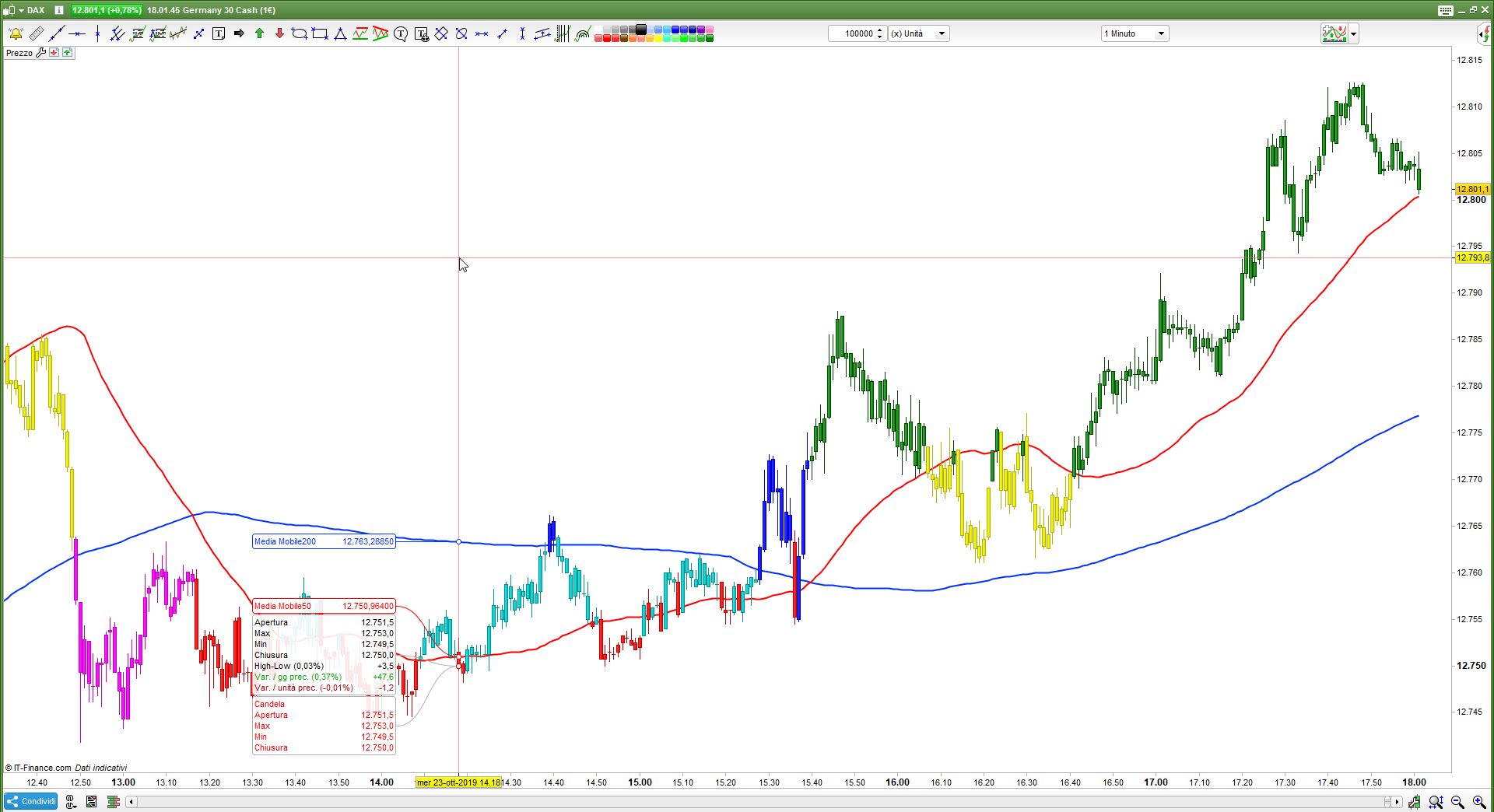 Per esempio, se il prezzo di chiusura di una candela è maggiore della mm50 e la mm50 è maggiore della mm200, allora la candela sarà colorata di verde.