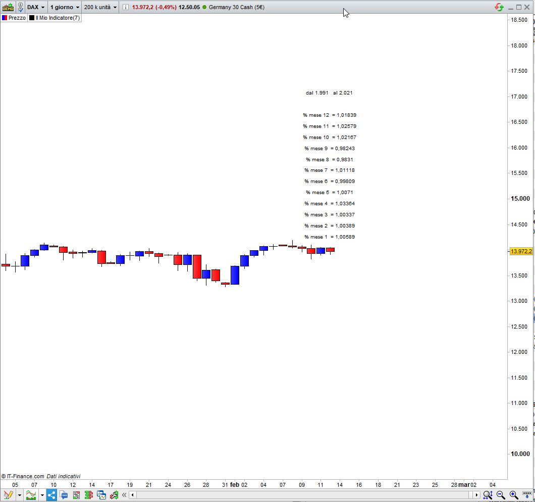 ovvero, vorrei sommare tutti i mesi di gennaio del dow jones per vedere nel mese di gennaio qual’è stata la media della sua performance, così come di febbraio e così via, per avere una panoramica dei mei che statisticamente siano i migliori o i peggio per un determinato strumento che vado ad analizzare, così da ricavarne un determinato vantaggio statistico quando decido di entrare a mercato.