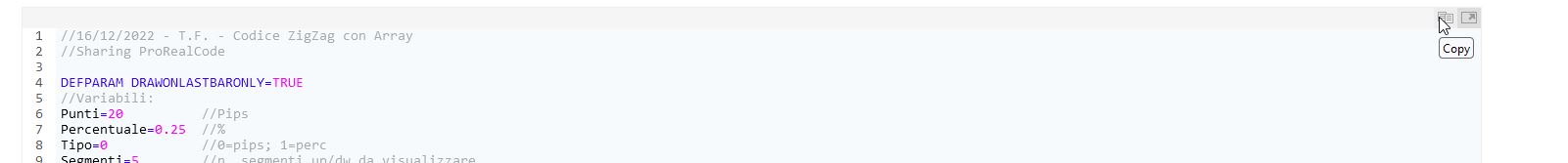 Salve a tutti. Non avendo trovato nel sito alcun codice relativo allo zigzag classico, pubblico questa versione scritta da me con l’ausilio degli array. L’ho confrontato con l’indicatore delle piattaforma e i risultati sono pressocchè identici sia nella modalità pips che in percentuale.