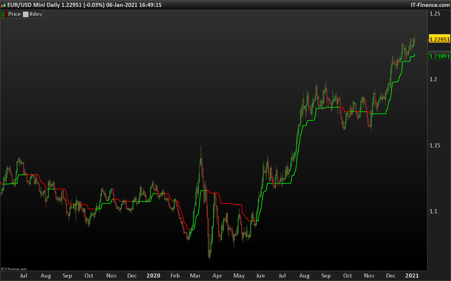 Here is the first one, similar to a supertrend somehow, add it 3 times with different Length: Short-term: 1.5 / Mid-term: 3.0 / Long-term: 4.5