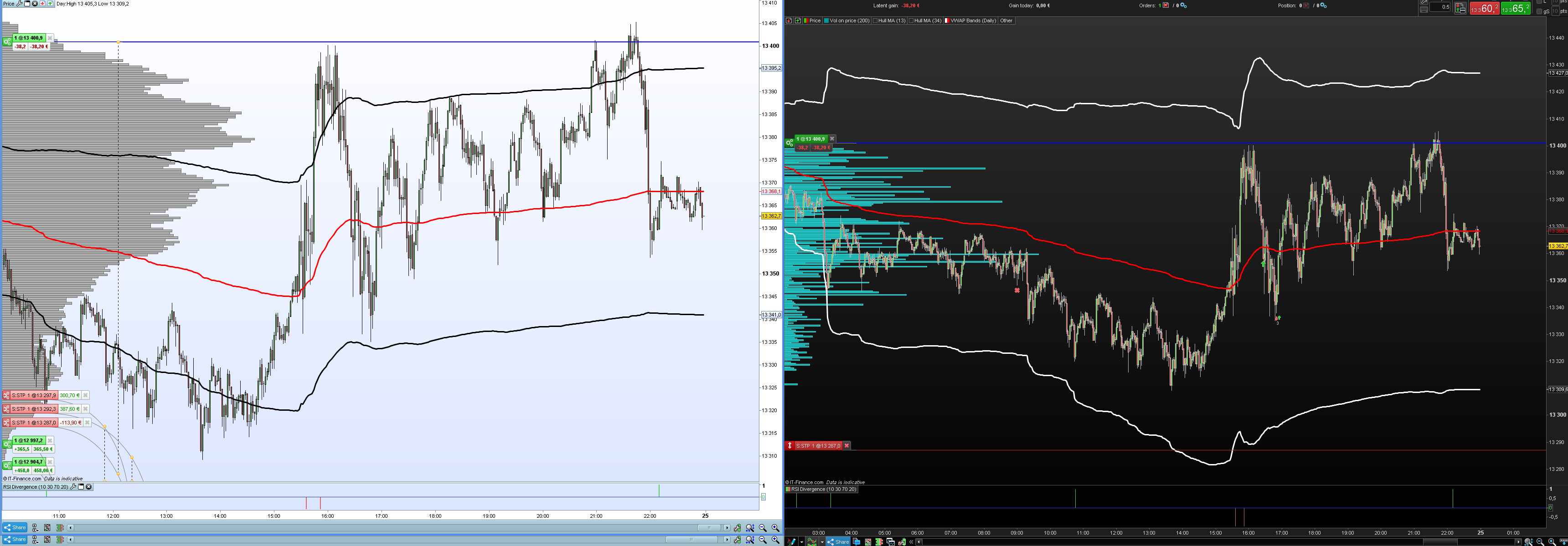 the same indicators are represented on both sides (VWAP bands and volume on price)