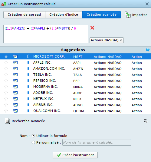 Sous ProRealTime version 12, on peut créer ses propres indices grâce à l’outil “instruments calculés”, il faut sélectionner l’onglet “indices” et choisir ses instruments en les ajoutant les uns aux autres avec le symbole +.