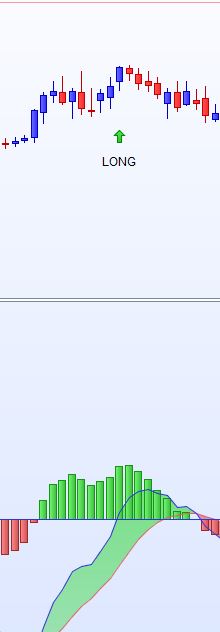 Wie im Bild ersichtlich möchte ich das, wenn der MACD die Nulllinie überquert und der Schlusskurs gestern kleiner ist als der Schlusskurs heute, dann soll mir das im Chart mit einem Pfeil und dem Wort long angezeigt werden.