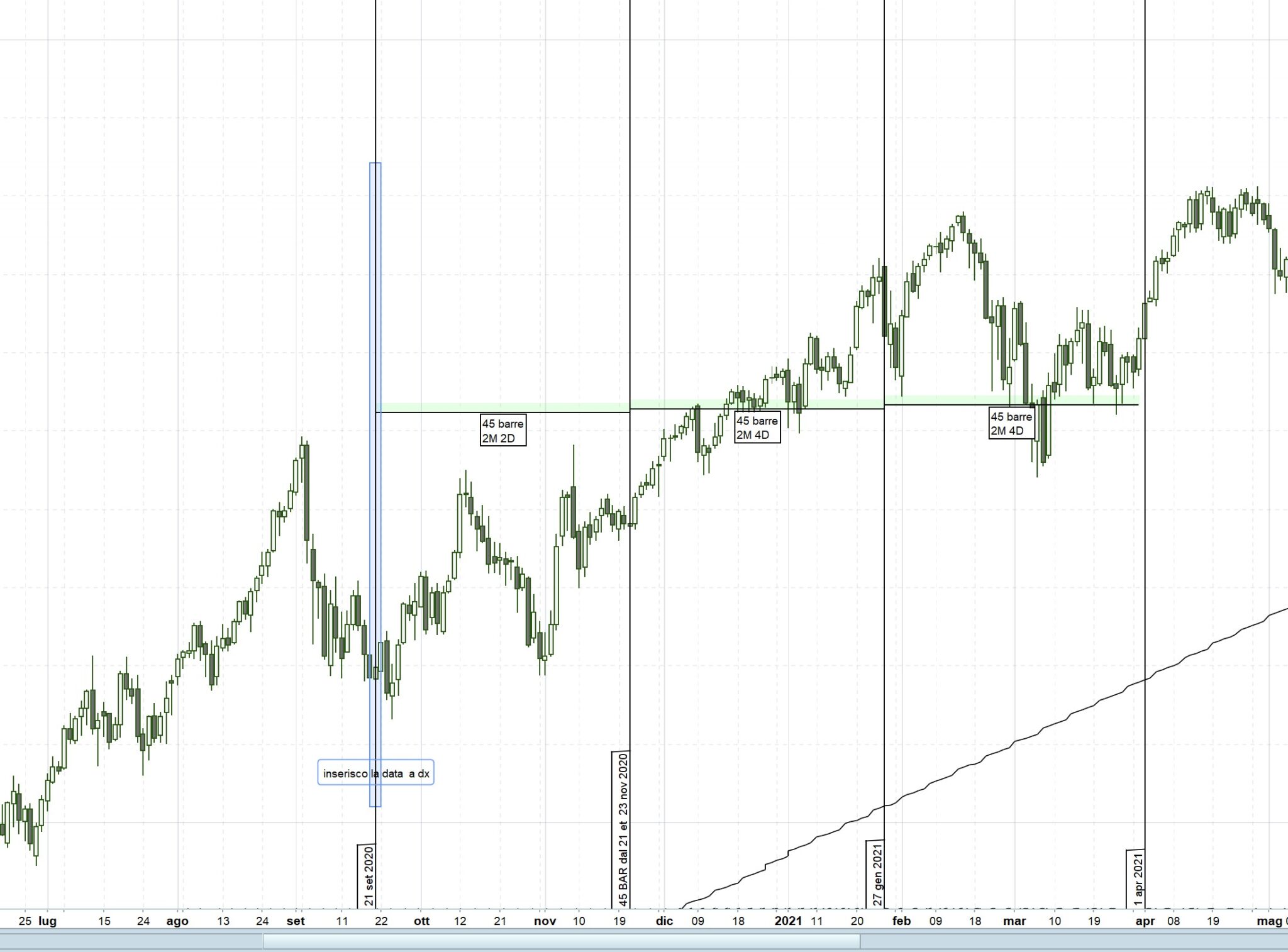 sarebbe ideale poter inserire la data di partenza (da un max o min) e far si che lui poi mi disegni delle linee verticali dopo 45barre 60 barre ecc ecc e che queste si ripetino X volte