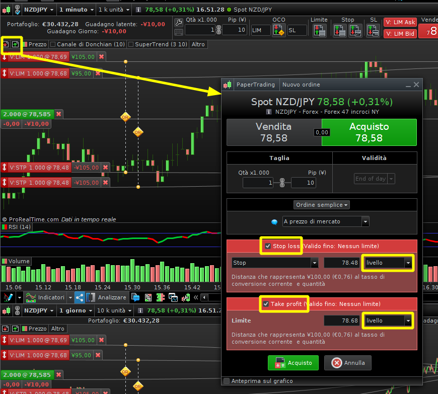 Per inserire una serie d’ordini a mercato tutti con un identico livello di SL e TP, l’alternativa è immetterli utilizzando la mascherina per l’inserimento manuale degli ordini, come da screenshot allegato. Consigliamo però di sperimentare bene questa meccanica in papertrading prima di utilizzarlo su un conto reale.