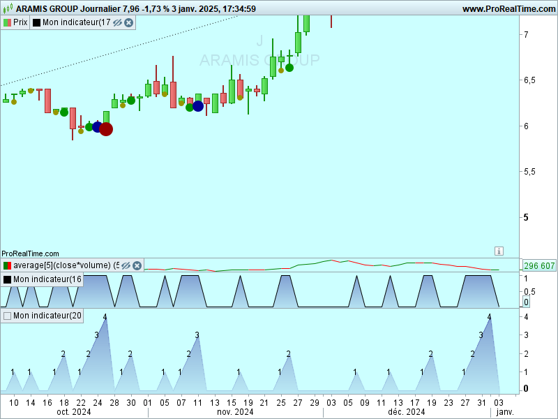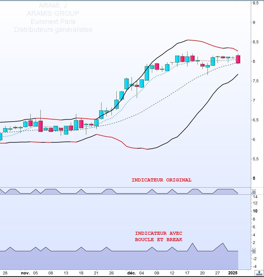merci pour votre suggestion mais cela ne fonctionne pas. J’avais essayé cette possibilité mais le résultat escompté diffère du code de base (en fichier joint). J’ai pris pour exemple le titre sur Euronext Aramis en journalier. Le premier indicateur est la version non optimisée proposée initialement. La seconde votre proposition. Le dernier Inside bar commence le 27/12/24 et il est clôturé le 02/01/25 soit 4 séances. Sur votre proposition du 27/12 au 30/12. Merci en tout cas pour votre aide.