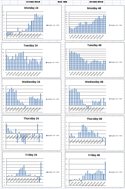 My 48 hour buy, hold and then sell test would indicate that that is not far off the mark although I am not sure that between 9 and 10 are necessarily the best times (maybe for very short term trades but not 48 hour ones). Wednesday lunchtime through to Friday lunchtime appears to be a very good time to walk away from trading the DAX long and go and do something better. Now that is a very simple filter to add to any DAX strategy that does not hold for longer than 48 hours. It should give an edge if the DAX continues to have similar daily characteristics in the future.