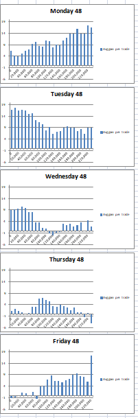 Analysing the 48 bar hold it seems that the beginning of the week is a better time to buy and then things start tailing off as the week progresses. Interestingly late on Friday is a good time to buy and hold for 48 bars. That kind of reminds me of Warren Buffett’s theory of buying when others are getting out!
