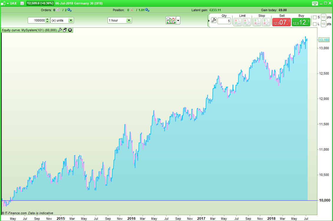 Wednesday Long on Dax, final1234567891011121314151617181920Defparam cumulateorders = falseTradingDay = Opendayofweek = 3TradingTime = time = 080000position = 1// maincodeIf TradingDay and TradingTime thenbuy position contracts at marketEndifIF Longonmarket and time= 070000 Thensell at marketEndifSet Stop %Loss 2 // as insuranceSet Target %profit 1.907/07/2018 at 3:04 PM #75534If only it were that easy! I am guessing that you are on a different trading clock tome (I use GMT +1) but this is what I get using time in as 070000 and time out of 060000.
