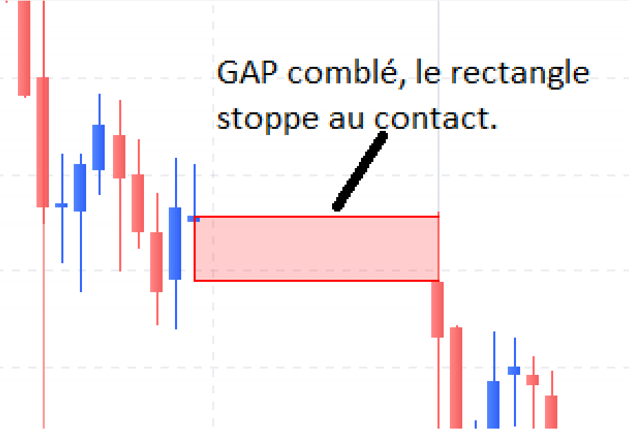 Sur la barre suivante, il vérifie avec le temps de barre actuel en secondes. Si pareil, alors pas d’écart. Si elle est différente, la barre précédente (bar-1) doit être la dernière bougie avant l’écart. La boîte dessinée est comprise entre (bar-1 ) et bar (barre actuelle).