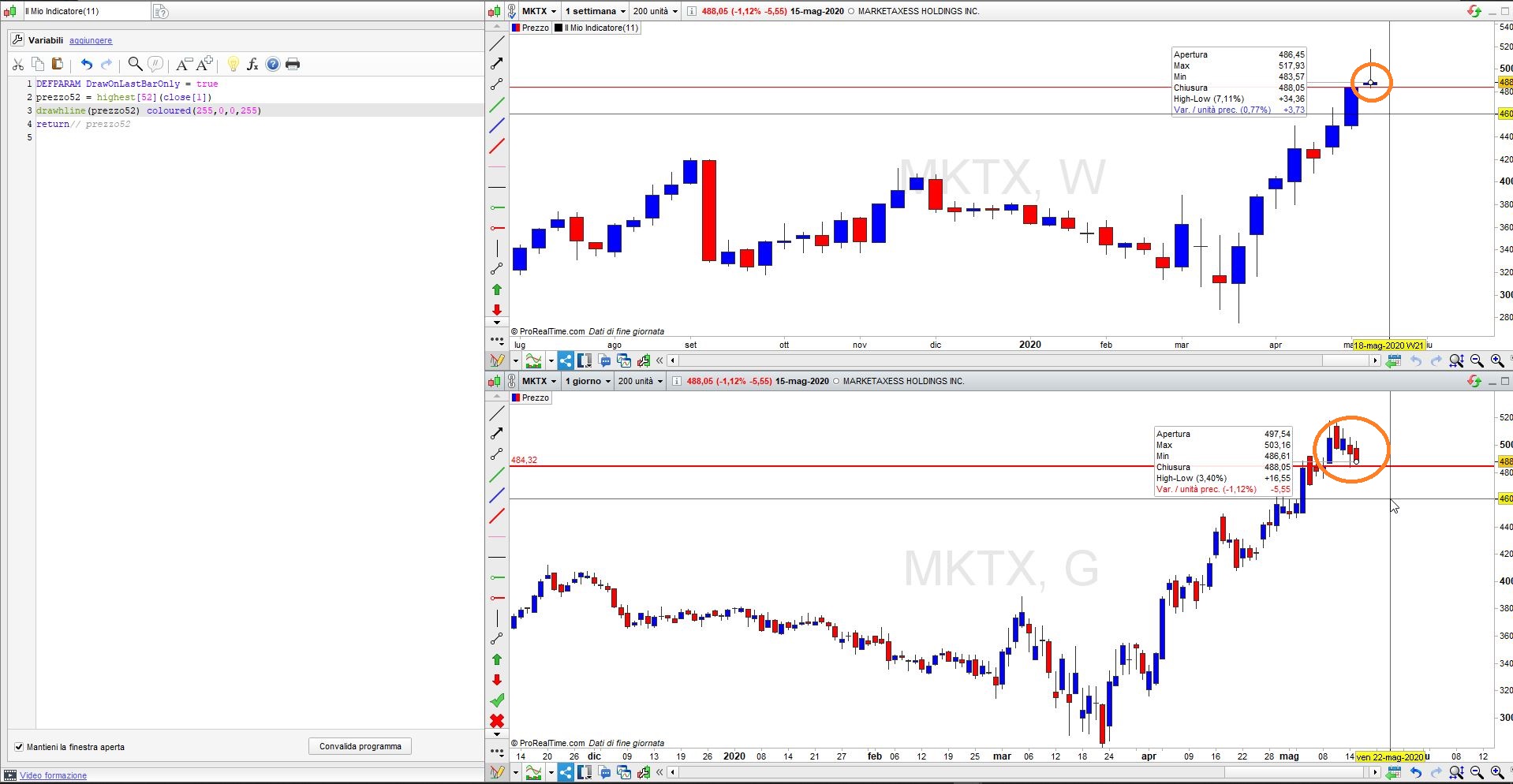 ho verificato, in effetti sul settimanale 11/5 il prezzo è 486, mentre sul giornaliero il prezzo max di 512 è del 12/5 e il 13/5 è stato più basso, quindi per ovviare a questo problema, cosa suggerisci oppure quale sarebbe il codice corretto?