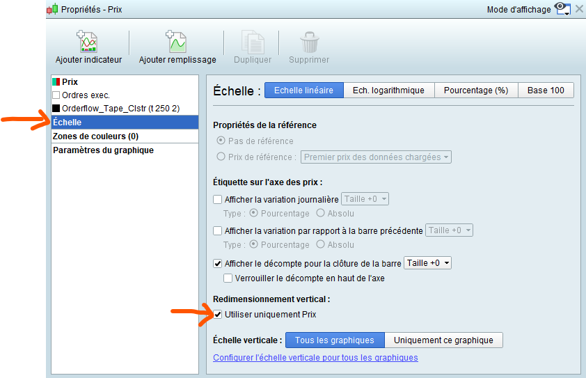 Maybe your scale on your daily chart isn’t set up the same way as in the other charts, you can check with right click on price scale on right margin, then in the menu pick the one at the end about “configuration of the zone” (not sure the exact english name of it), then as in attached image you are in “scale” menu (left side) and on the right side of the panel check the box about using price only is checked, it will avoid making visible the values 1 to 4 of the returned “colour” variable of your indicator added to price, assuming it was that kind of squashing.