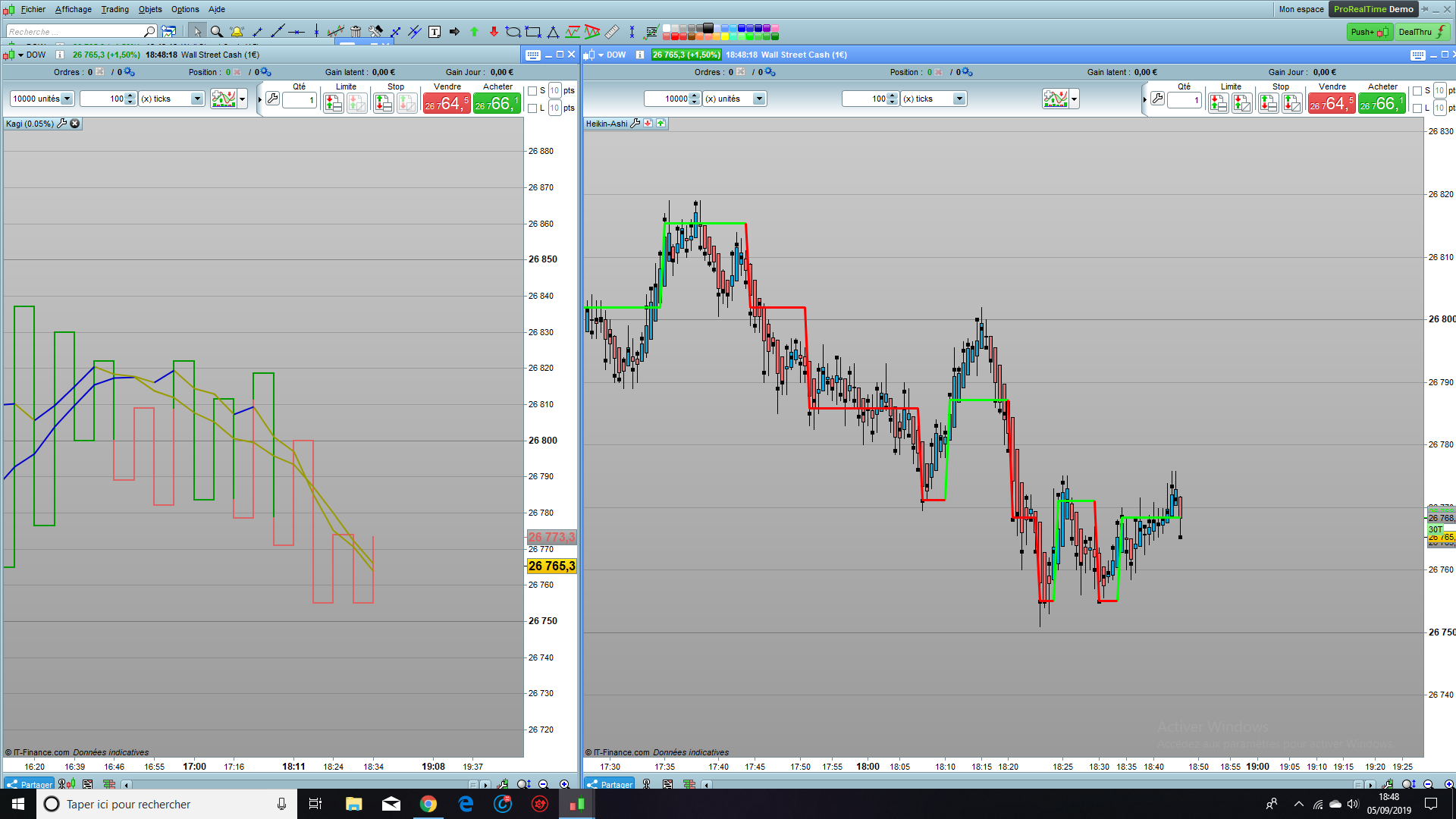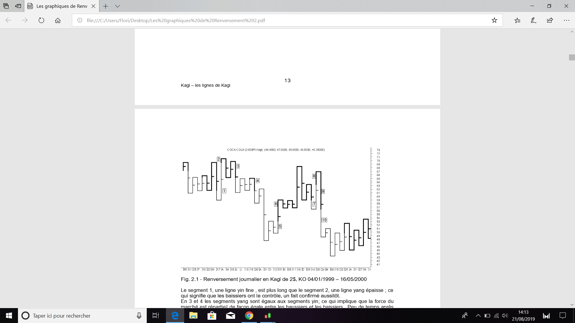 Par ailleurs, puisque le Kagi bouge selon des pas de mouvement du prix (à l’instar du Renko..), sa construction commence à partir du premier prix trouvé sur le graphique, donc il faut afficher les mêmes historiques sur les 2 graphique si on veut comparer.