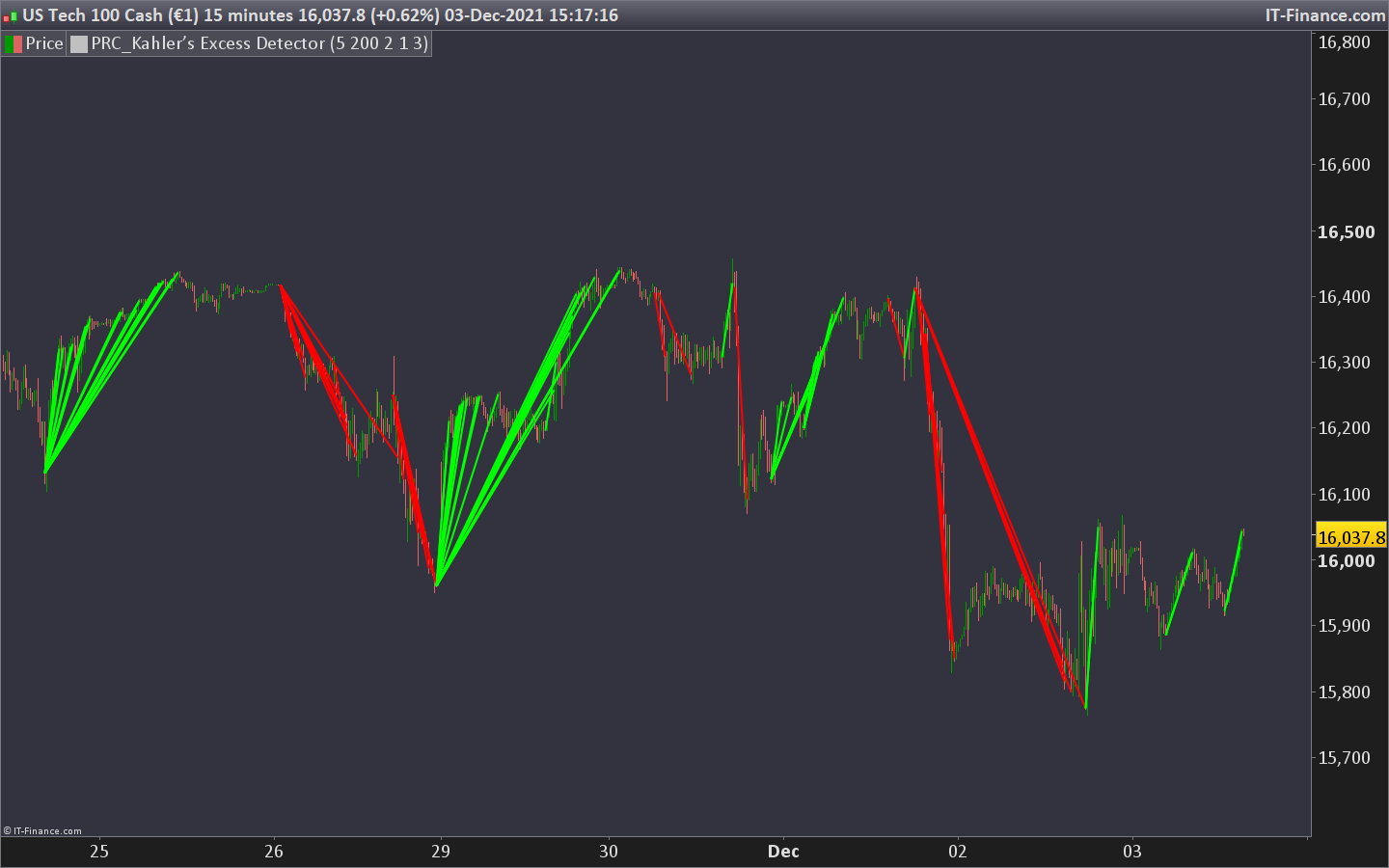 This indicator detects excess market moves. It is stated, that it “overcomes many of the downsides of traditional ones like RSI or Bollinger Bands”.