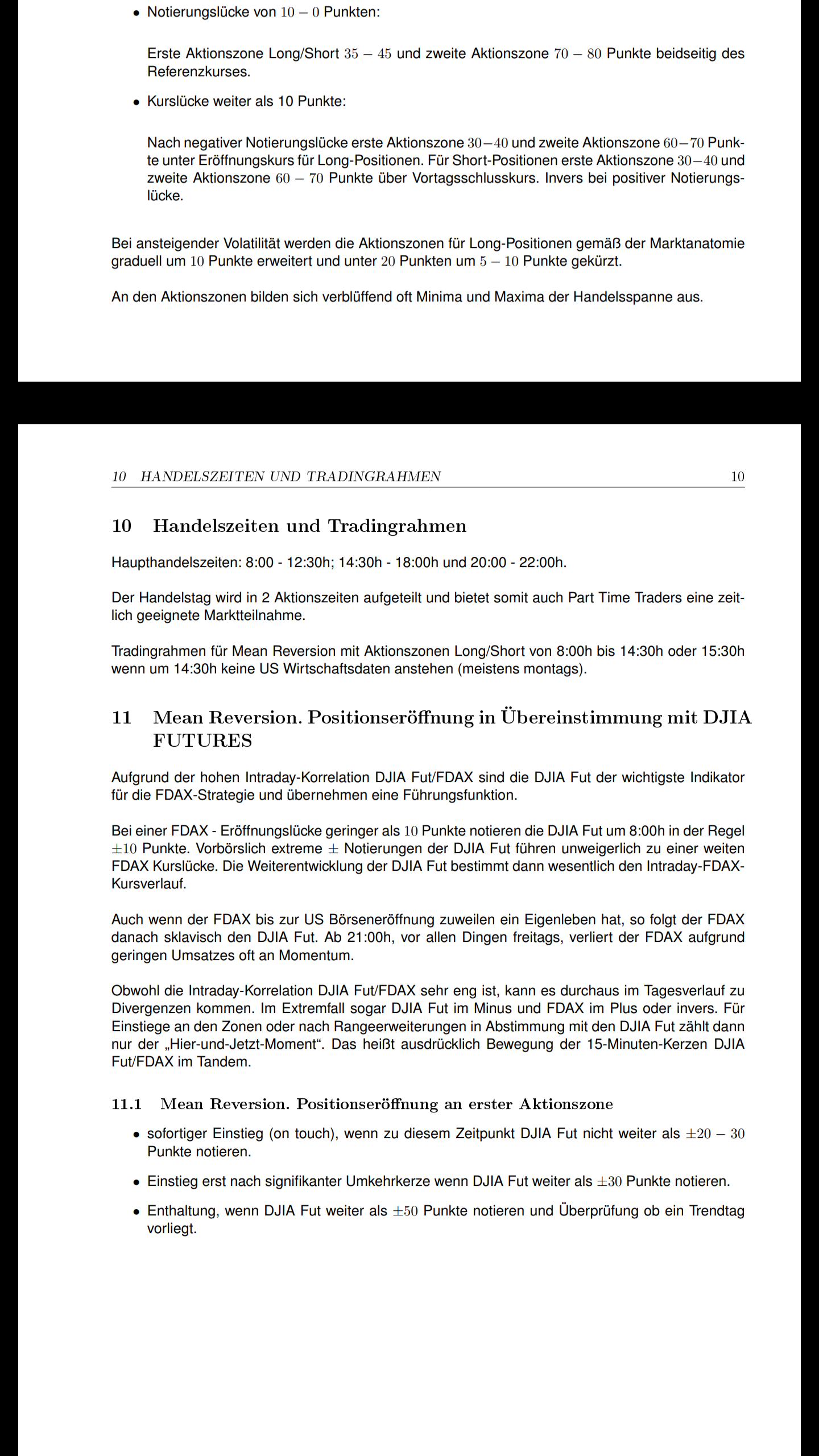 Nach negativer Notierungslücke erste Aktionszone 30−40 und zweite Aktionszone 60−70 Punkte unter Eröffnungskurs für Long-Positionen. Für Short-Positionen erste Aktionszone 30−40 und