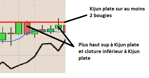 le plus haut des prix du jour ont croise à la hausse la Kijun plate d’au moins 2 bougies et la cloture s’est fait en dessous de cette même kijun plate.