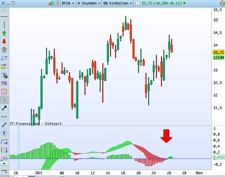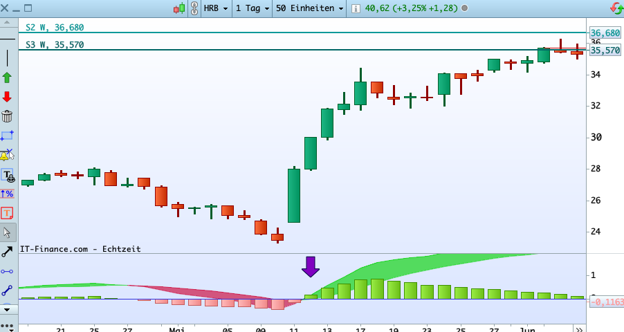 Den Crossover erfolgt nicht durch das Histogramm, sondern durch die beiden Durchschnitte Linien ( die MACD-Linie und die MACD-Signallinie), die sich gerade an der Nulllinie kreuzen, wie im Beispiel des HRB am 12.05.22.