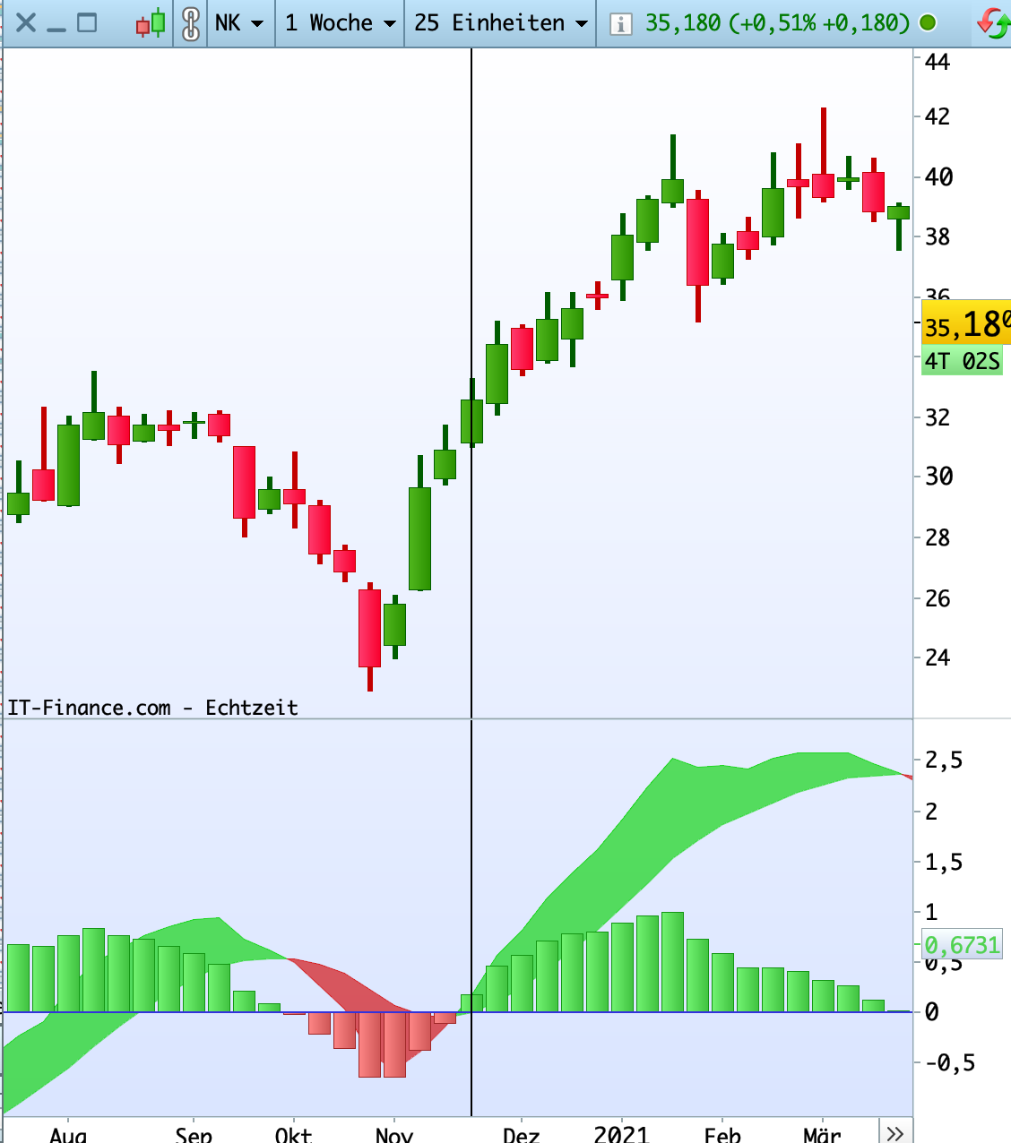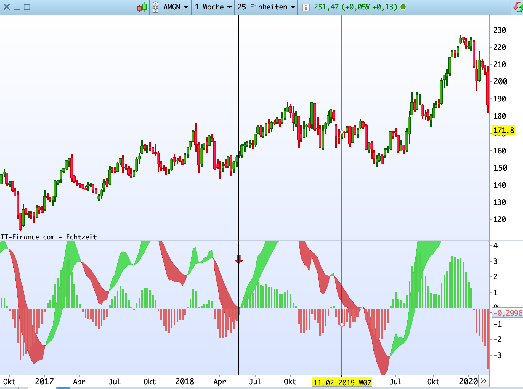 Wie im Falle von ALNG auf Tages-Charts kreuzen sich die Durchschnitte bei -10 statt bei Null.