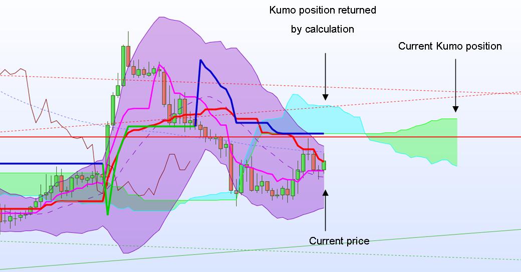 However, this formula returns the Kumo cloud position right above (or below) the current price bar, not the position as displayed on the Ichimoku representation (which is 26 periods ahead of the current period).