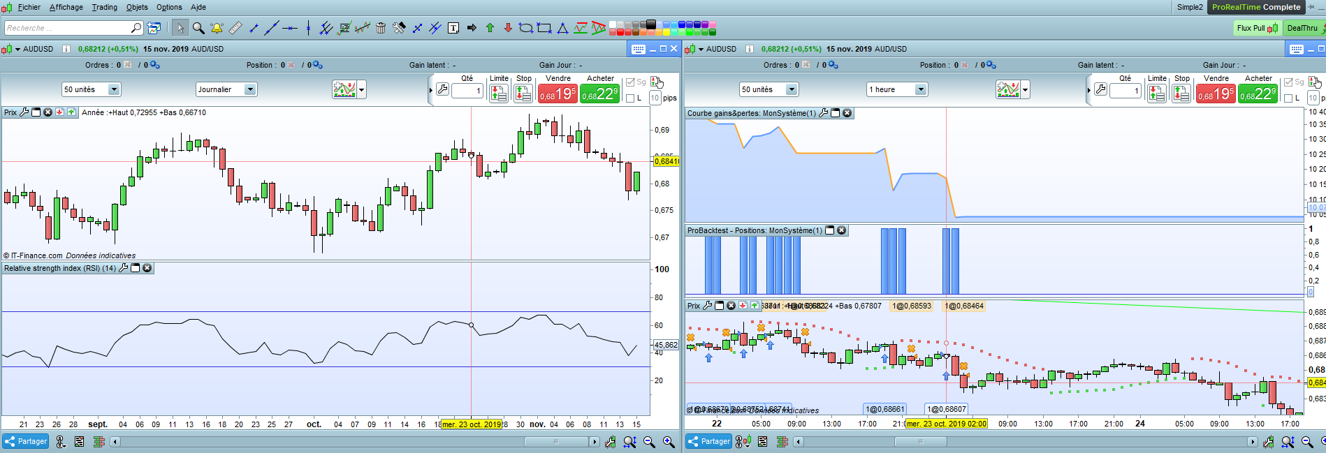 A la fin de la journée, en effet sur le timeframe daily, le RSI[0] est < au RSI[1]. Hors le 23 octobre dans une bougie d’1 heure, on regarde les infos du graphique daily en fin de journée de la veille ! Sinon, tel que tu le décrits, on connaîtrait déjà le futur ! 😉 Et oui les multiples unités de temps, c’est une sacré gymnastique intellectuel 🙂