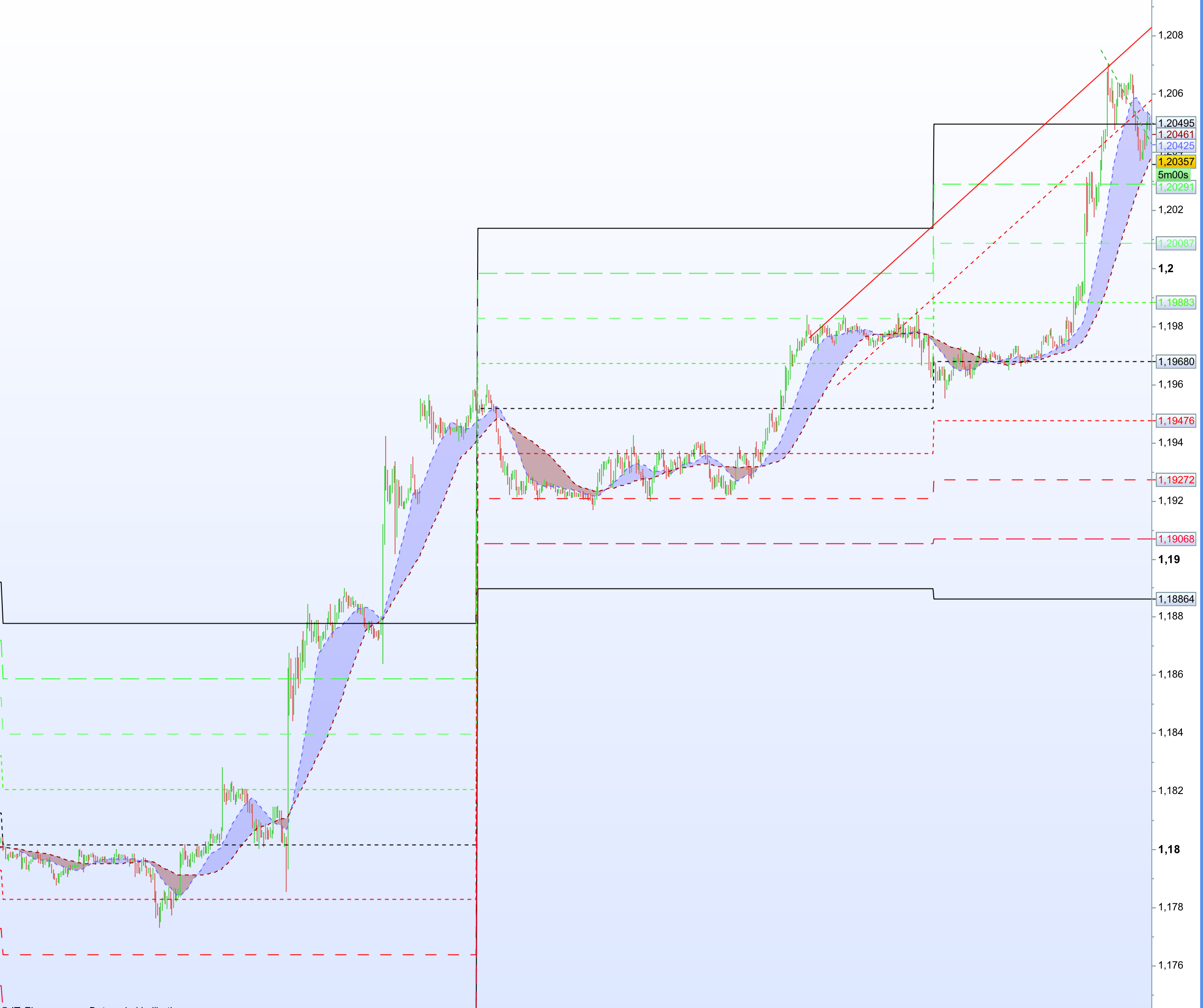 There is a picture of the indicator attached. I want to buy at the first green line in the middle and sell at the second, vice versa sell at the first red line from the middle and target profit at the second red line.